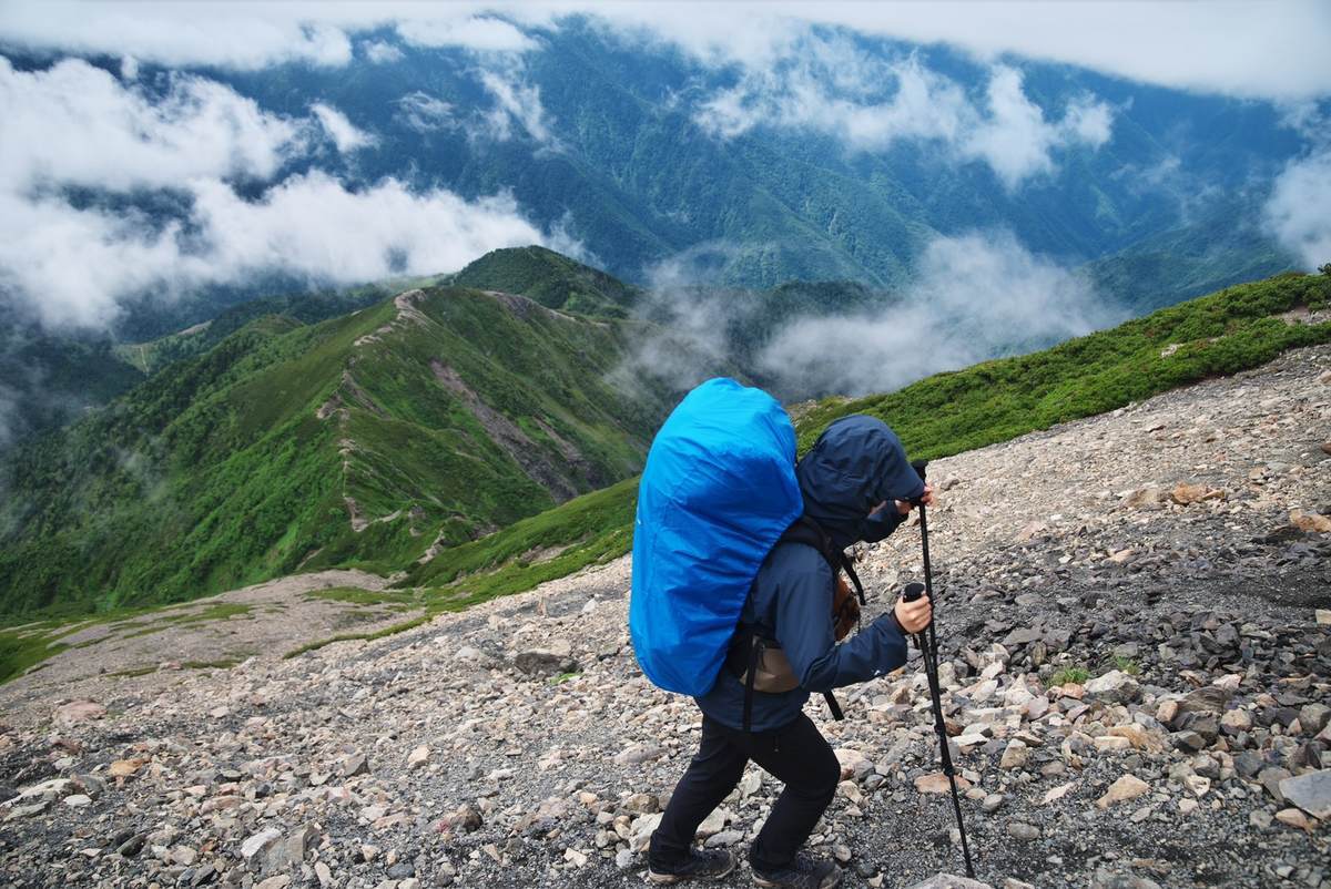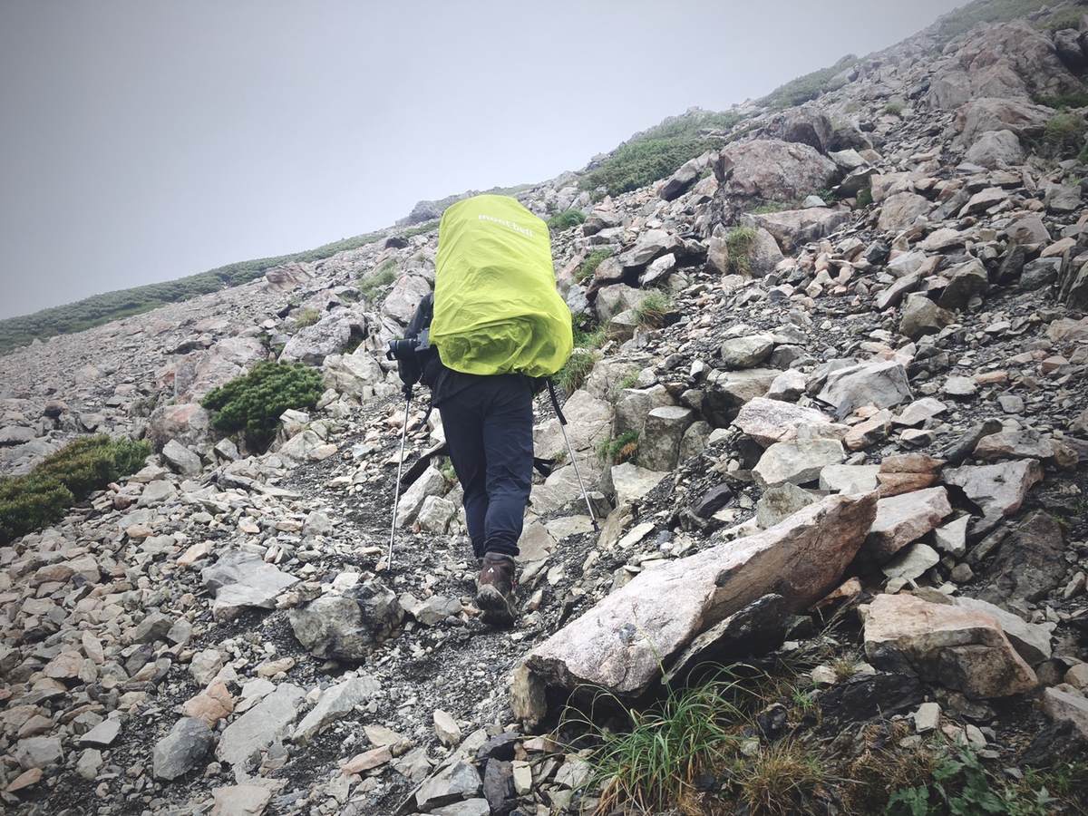 岩が転がり落ちてきそうな急斜面を一歩ずつ歩きます。