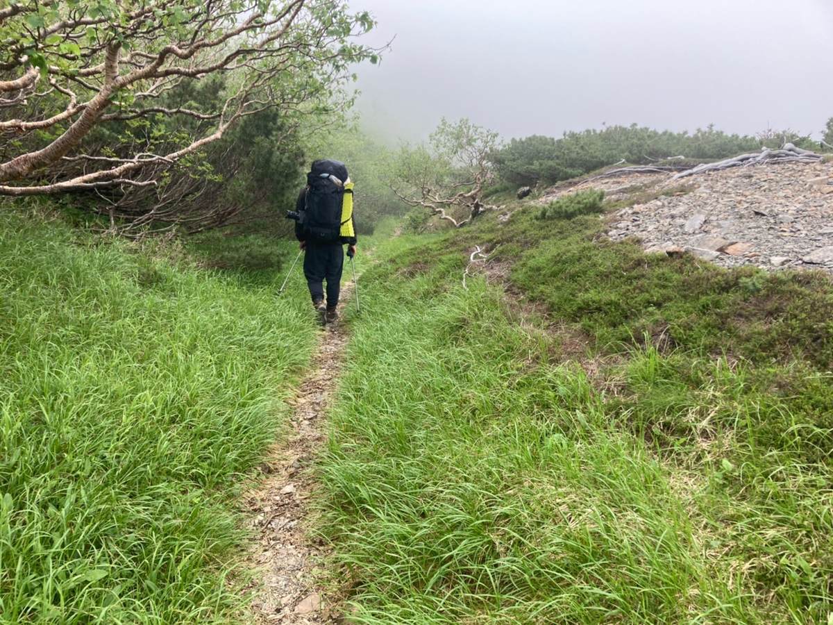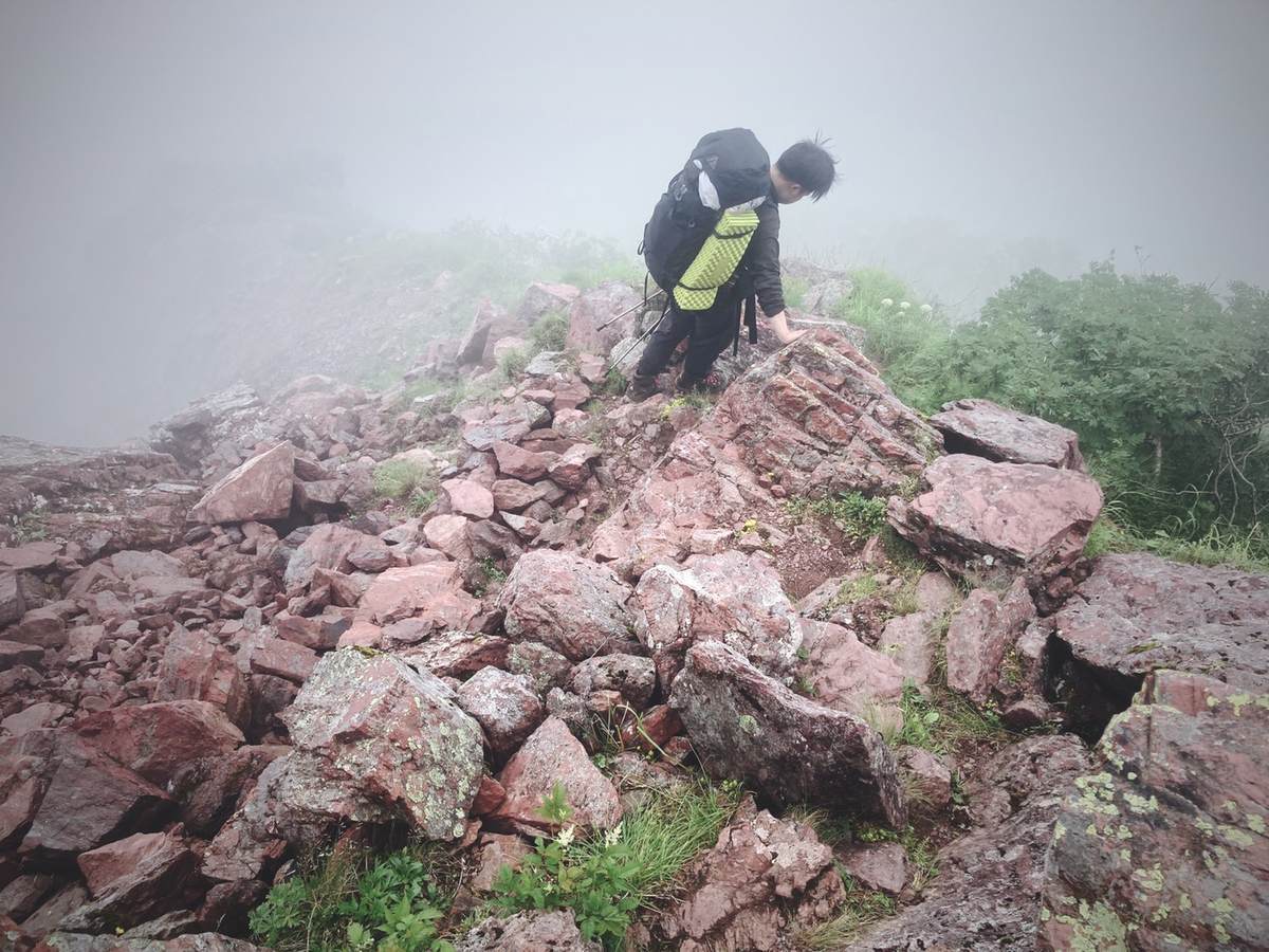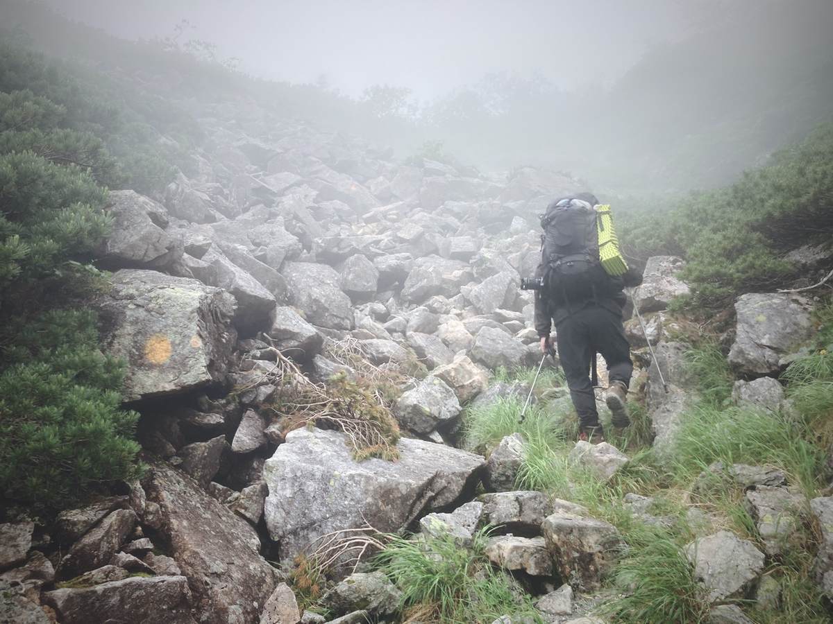 暑いのでレインパンツは脱いで、ガスの中ですが一生懸命登りました。